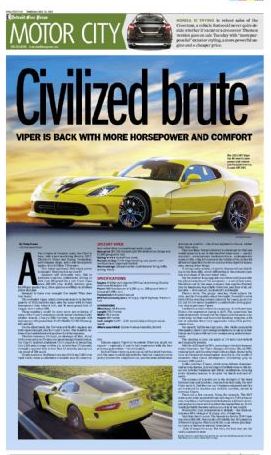 The November 22, 201 article, “Civilized brute: Viper is back with more horsepower and comfort,” reviewed the 2013 SRT Viper with 40 more horsepower than previous models, and 40 more pound-feet of torque, now a robust 600.
